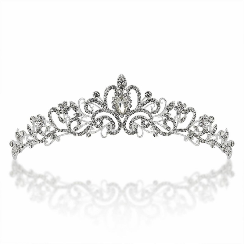 Diese atemberaubende silberne Tiara ist einer Prinzessin würdig. Verfügt über wunderschöne Wirbel, die mit funkelnden Kristallen und Strasssteinen besetzt sind. Es passt perfekt zu weißen und weißen Diamant-Brautkleidern.