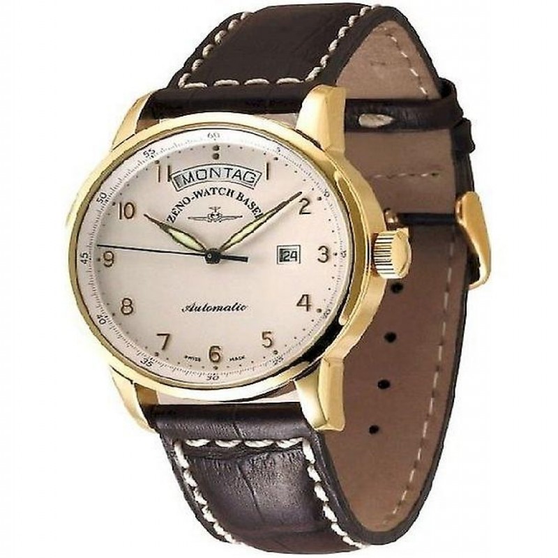 Marke: Zeno Watch Basel Produktgruppe: Uhren Zielgruppe: Herren Gehäusefarbe: Gelbgold Glas: Saphirglas Armbandmaterial: Leder ? Mm: 42 Gehäusematerial: Edelstahl Zifferblattfarbe: weiß ? Sonstiges: Sichtboden Sonstiges: Swiss Made Anzeige: Analog Armbandfarbe: Braun Beschichtungsoberfläche: Poliert Gehäuseform: Rund Uhrentyp: Automatikuhren Uhrwerktyp: Automatisch Verschlussart: Dornschließe