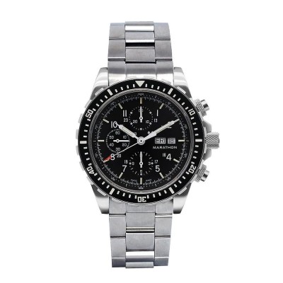 Marathon 46 mm Jumbo Pilot/Diver Automatic Chronograph (CSAR)-Uhr aus Edelstahl. Die 46 mm Jumbo Pilot/Diver Automatic Chronograph (CSAR)-Uhr wird allgemein als Search and Rescue (CSAR)-Chronograph bezeichnet und ist die begehrteste in unserer SAR-Klasse. Es gilt als der „Heilige Gral“ unserer Uhren und ist die perfekte Wahl für alle, die in puncto Qualität und Leistung das Beste verlangen. Die Stoppuhrfunktion ist mit einem automatischen Chronographenwerk mit 25 Steinen und einer Genauigkeit von 1/5 Sekunde ausgestattet und nutzt eine Dezimalzeit von 1/100 Minuten zur Verwendung in Flugprotokollen und zur Verfolgung des Kraftstoffverbrauchs. Die Uhr kann die verstrichene Zeit bis zu 12 Stunden messen und ist somit die ideale Wahl für Piloten und Taucher. Angetrieben wird das Uhrwerk von einem ETA Valjoux 7750 mit Incabloc®-Stoßdämpfer, der in allen Situationen eine zuverlässige und präzise Zeitmessung gewährleistet. Die Uhr verfügt außerdem über einen Kalender mit Tag und Datum. Für einfaches Ablesen bei schlechten Lichtverhältnissen verfügt das CSAR über Tritiumgasröhren und MaraGlo™-Beleuchtungsfunktionen. Das Glas besteht aus Saphir und ist somit kratzfest und langlebig, während die verschraubte Krone eine Wasserdichtigkeit von bis zu 30 ATM garantiert. Das Gehäuse und das Armband bestehen aus 316L-Edelstahl und haben eine gebürstete Textur, die ihnen ein elegantes und modernes Aussehen verleiht. Die einseitig drehbare Lünette verfügt über eine 60-Minuten-Skala und die Uhr hat eine Tauchklassifizierung von 30 ATM, was sie perfekt zum Tauchen und für andere Wasseraktivitäten macht. Die Uhr hat einen Gehäusedurchmesser von 46 mm, eine Gehäusedicke von 18 mm und eine Bandanstoßbreite von 22 mm. Uhrwerk: ETA Valjoux 7750 mit Incabloc? Stoßdämpfer